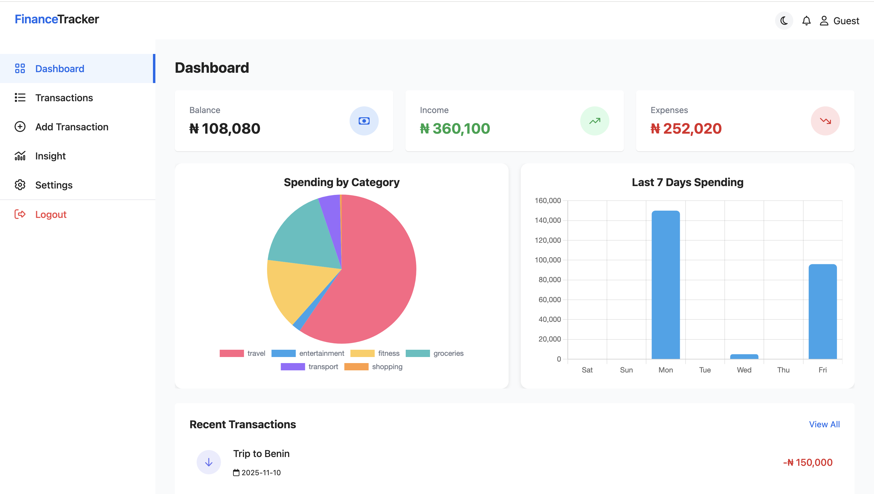 I built a finance tracker that works with guest login or user sign-in, helping people easily track their income and expenses. It includes a dashboard, full transaction list, insights for better financial understanding, and a settings page for updating username, currency, and theme mode.